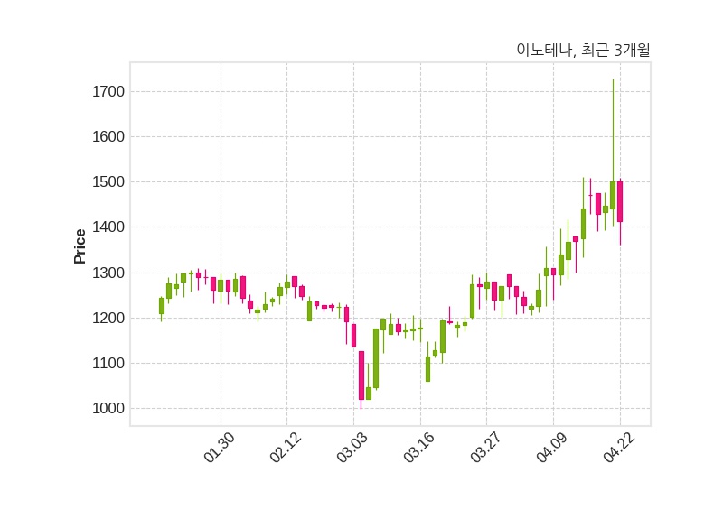 한편, 이노테나는 장 마감 이후 해당 기업공시를 발표했으며 오늘 종가가 1,413원, 거래량은 851,933주로, 직전 거래일 대비 88원(-5.86%) 하락했다.