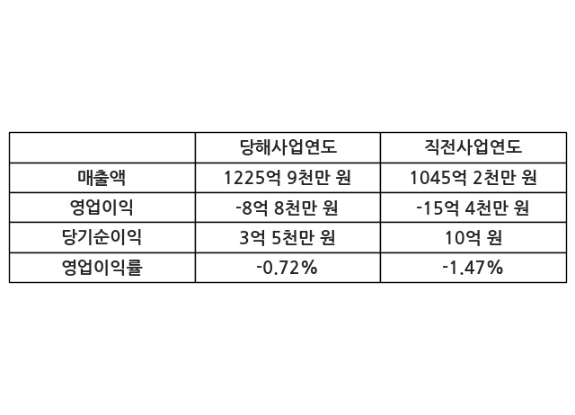 이번사업연도의 매출액은 직전사업연도 대비 17.29% 증가한 1225억 9천만 원, 영업이익은 -8억 8천만 원, 당기순이익은 3억 5천만 원이라고 공시했다.