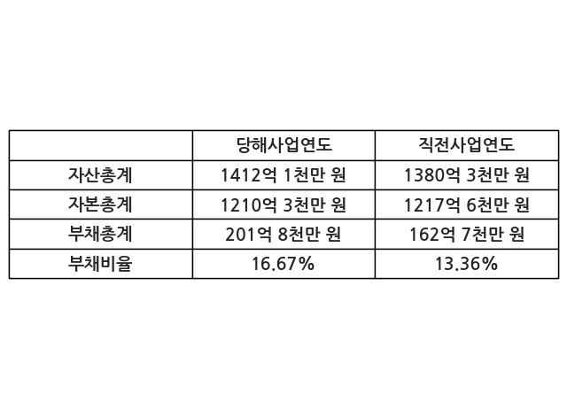 또한, 이번사업연도의 자산총계는 1412억 1천만 원으로 직전사업연도 대비 2.3% 증가한 한편, 부채총계는 201억 8천만 원으로 24.03% 증가, 자본총계는 1210억 3천만 원으로 -0.6% 감소했다.