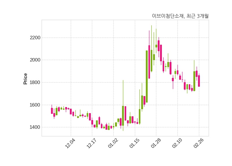 한편, 이브이첨단소재는 장 마감 이후 해당 기업공시를 발표했으며 오늘 종가가 1,764원, 거래량은 933,042주로, 직전 거래일 대비 88원(-4.75%) 하락했다.