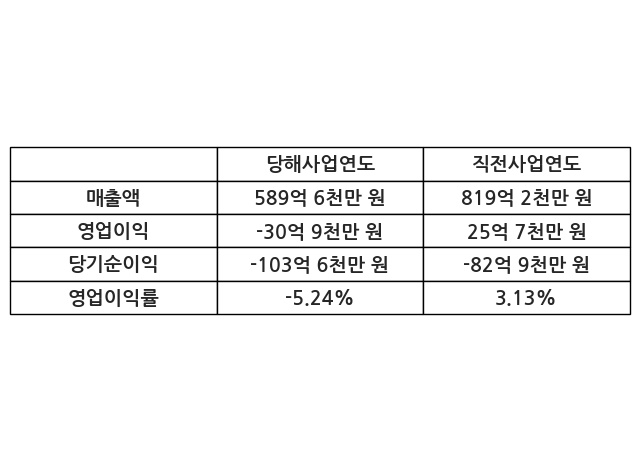 이번사업연도의 매출액은 직전사업연도 대비 -28.03% 감소한 589억 6천만 원, 영업이익은 -30억 9천만 원, 당기순이익은 -103억 6천만 원이라고 공시했다.