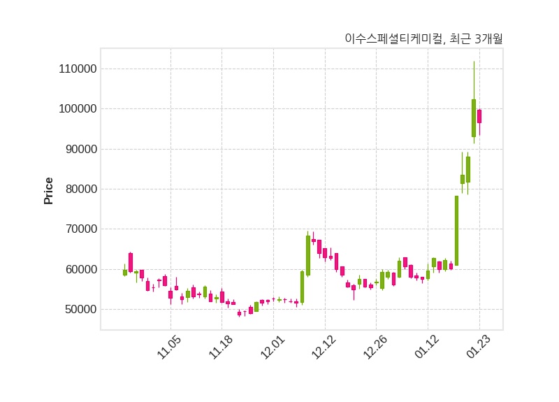 한편, 이수스페셜티케미컬은 장 마감 이후 해당 기업공시를 발표했으며 오늘 종가가 96,600원, 거래량은 1,340,568주로, 직전 거래일 대비 5,700원(-5.57%) 하락했다.
