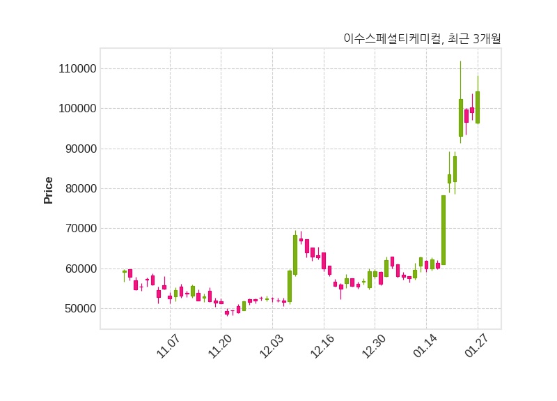 한편, 이수스페셜티케미컬은 장 마감 이후 해당 기업공시를 발표했으며 오늘 종가가 104,300원, 거래량은 1,309,517주로, 직전 거래일 대비 5,200원(+5.25%) 상승했다.