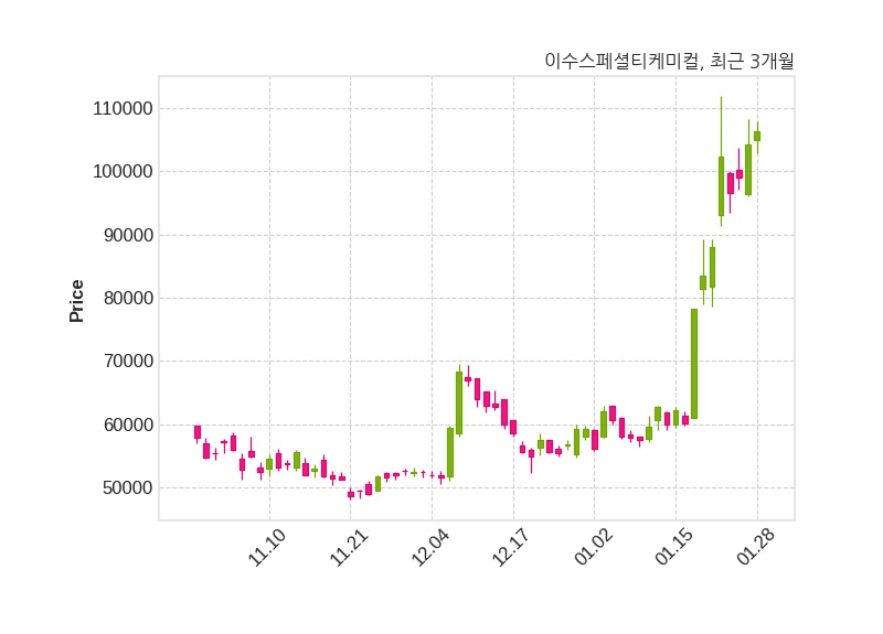 한편, 이수스페셜티케미컬은 장 마감 이후 해당 기업공시를 발표했으며 오늘 종가가 106,300원, 거래량은 797,969주로, 직전 거래일 대비 2,000원(+1.92%) 상승했다.