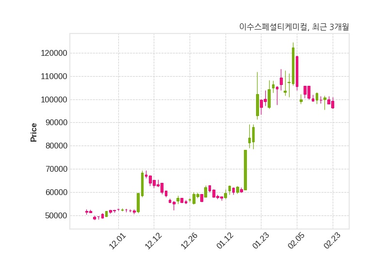이수스페셜티케미컬은 특별관계자 이수의 지분율이 35.53%에서 35.57%로 변동했다고 23일 공시했다. 한편, 이수스페셜티케미컬은 장 마감 이후 해당 기업공시를 발표했으며 오늘 종가가 96,400원, 거래량은 277,312주로, 직전 거래일 대비 1,700원(-1.73%) 하락했다.