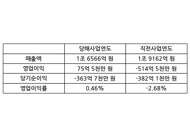 이번사업연도의 매출액은 직전사업연도 대비 -13.55% 감소한 1조 6566억 원, 영업이익은 75억 5천만 원, 당기순이익은 -363억 7천만 원이라고 공시했다.