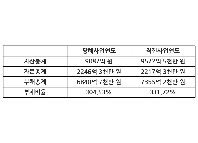 또한, 이번사업연도의 자산총계는 9087억 원으로 직전사업연도 대비 -5.07% 감소한 한편, 부채총계는 6840억 7천만 원으로 -7.0% 감소, 자본총계는 2246억 3천만 원으로 1.31% 증가했다.