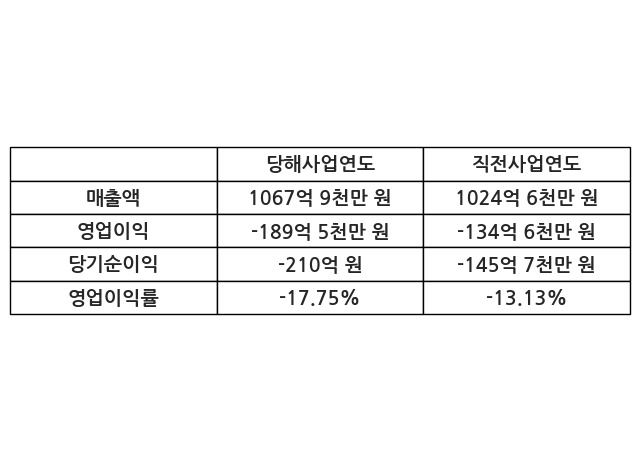이번사업연도의 매출액은 직전사업연도 대비 4.23% 증가한 1067억 9천만 원, 영업이익은 -189억 5천만 원, 당기순이익은 -210억 원이라고 공시했다.