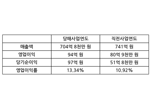 이번사업연도의 매출액은 직전사업연도 대비 -4.88% 감소한 704억 8천만 원, 영업이익은 94억 원, 당기순이익은 97억 원이라고 공시했다.