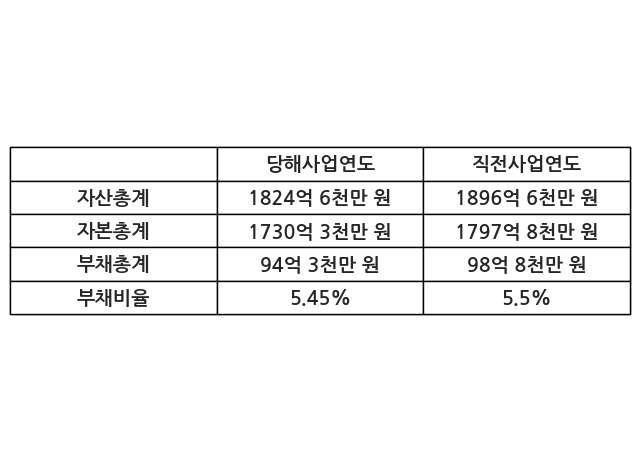 또한, 이번사업연도의 자산총계는 1824억 6천만 원으로 직전사업연도 대비 -3.8% 감소한 한편, 부채총계는 94억 3천만 원으로 -4.54% 감소, 자본총계는 1730억 3천만 원으로 -3.76% 감소했다.