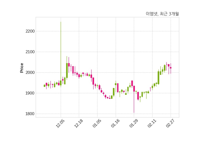 한편, 이엠넷은 장 마감 이후 해당 기업공시를 발표했으며 오늘 종가가 2,020원, 거래량은 16,001주로, 직전 거래일 대비 10원(-0.49%) 하락했다.
