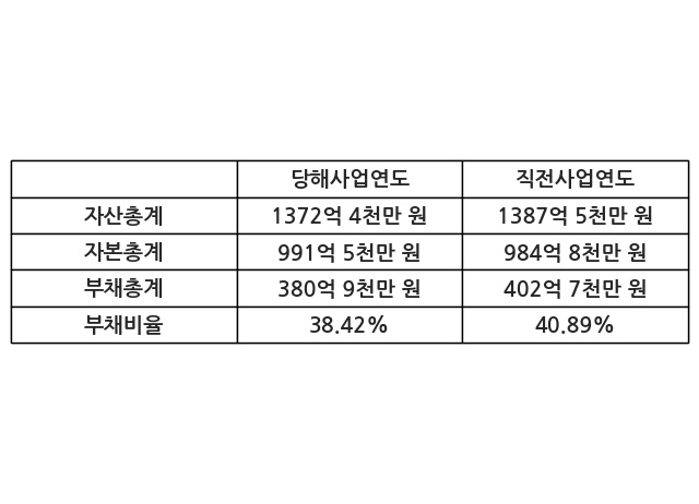 또한, 이번사업연도의 자산총계는 1372억 4천만 원으로 직전사업연도 대비 -1.09% 감소한 한편, 부채총계는 380억 9천만 원으로 -5.4% 감소, 자본총계는 991억 5천만 원으로 0.68% 증가했다.