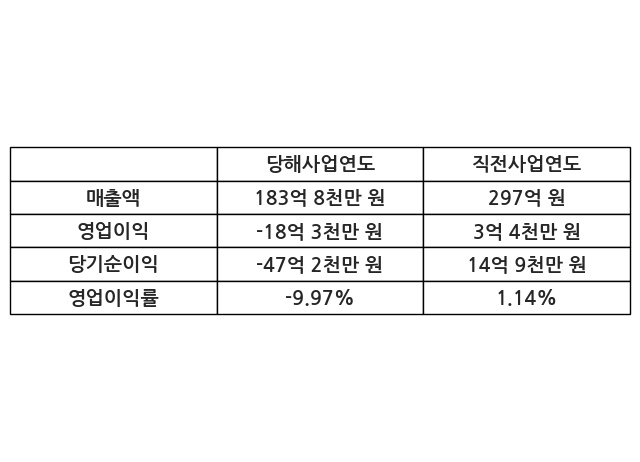 이번사업연도의 매출액은 직전사업연도 대비 -38.11% 감소한 183억 8천만 원, 영업이익은 -18억 3천만 원, 당기순이익은 -47억 2천만 원이라고 공시했다.