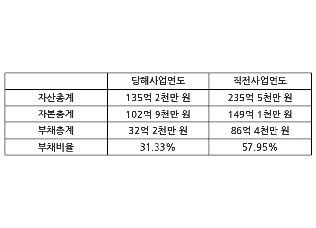 또한, 이번사업연도의 자산총계는 135억 2천만 원으로 직전사업연도 대비 -42.6% 감소한 한편, 부채총계는 32억 2천만 원으로 -62.68% 감소, 자본총계는 102억 9천만 원으로 -30.97% 감소했다.