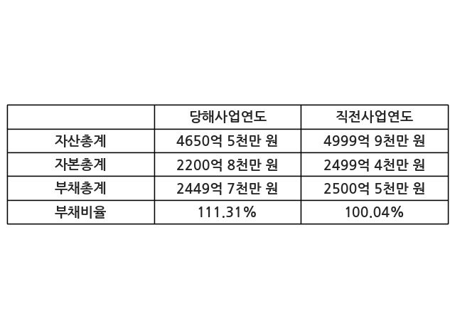 또한, 이번사업연도의 자산총계는 4650억 5천만 원으로 직전사업연도 대비 -6.99% 감소한 한편, 부채총계는 2449억 7천만 원으로 -2.03% 감소, 자본총계는 2200억 8천만 원으로 -11.95% 감소했다.