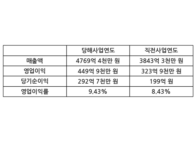 이번사업연도의 매출액은 직전사업연도 대비 24.1% 증가한 4769억 4천만 원, 영업이익은 449억 9천만 원, 당기순이익은 292억 7천만 원이라고 공시했다.