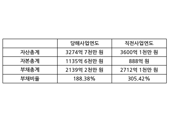 또한, 이번사업연도의 자산총계는 3274억 7천만 원으로 직전사업연도 대비 -9.04% 감소한 한편, 부채총계는 2139억 2천만 원으로 -21.13% 감소, 자본총계는 1135억 6천만 원으로 27.88% 증가했다.