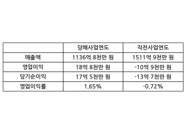 이번사업연도의 매출액은 직전사업연도 대비 -24.81% 감소한 1136억 8천만 원, 영업이익은 18억 8천만 원, 당기순이익은 17억 5천만 원이라고 공시했다.