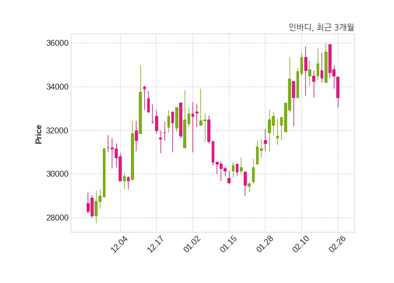 한편, 인바디는 장 마감 이후 해당 기업공시를 발표했으며 오늘 종가가 33,500원, 거래량은 68,623주로, 직전 거래일 대비 1,000원(-2.9%) 하락했다.