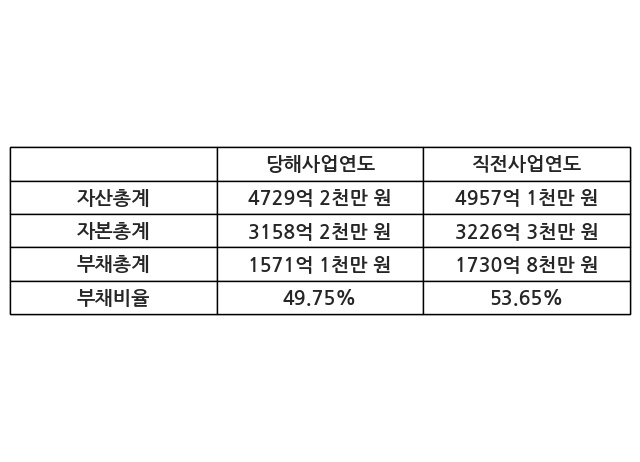 또한, 이번사업연도의 자산총계는 4729억 2천만 원으로 직전사업연도 대비 -4.6% 감소한 한편, 부채총계는 1571억 1천만 원으로 -9.23% 감소, 자본총계는 3158억 2천만 원으로 -2.11% 감소했다.