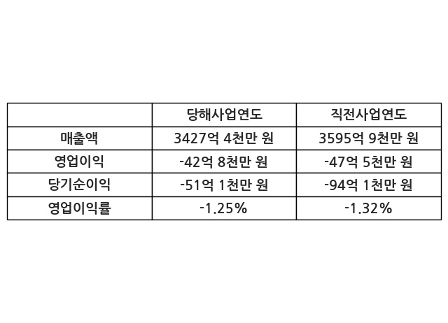 이번사업연도의 매출액은 직전사업연도 대비 -4.69% 감소한 3427억 4천만 원, 영업이익은 -42억 8천만 원, 당기순이익은 -51억 1천만 원이라고 공시했다.