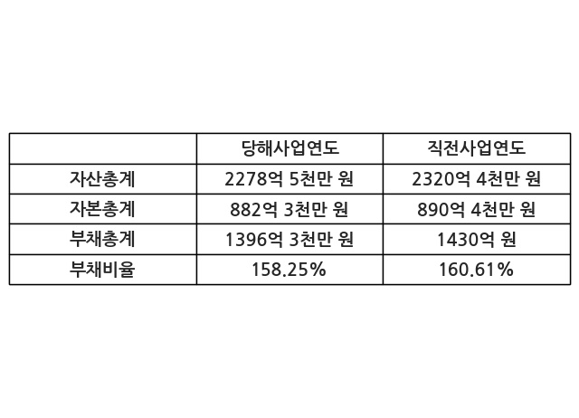 또한, 이번사업연도의 자산총계는 2278억 5천만 원으로 직전사업연도 대비 -1.8% 감소한 한편, 부채총계는 1396억 3천만 원으로 -2.36% 감소, 자본총계는 882억 3천만 원으로 -0.91% 감소했다.