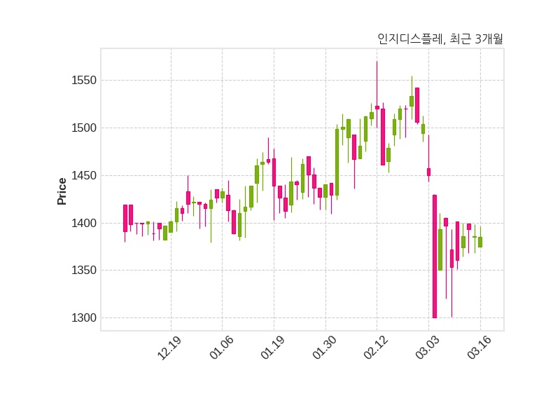 한편, 인지디스플레는 장 마감 이후 해당 기업공시를 발표했으며 오늘 종가가 1,385원, 거래량은 38,363주로, 직전 거래일 대비 1원(-0.07%) 하락했다.