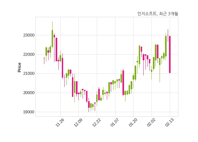 한편, 인지소프트는 장 마감 이후 해당 기업공시를 발표했으며 오늘 종가가 21,050원, 거래량은 38,478주로, 직전 거래일 대비 1,950원(-8.48%) 하락했다.