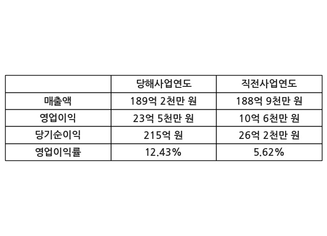 이번사업연도의 매출액은 직전사업연도 대비 0.17% 증가한 189억 2천만 원, 영업이익은 23억 5천만 원, 당기순이익은 215억 원이라고 공시했다.