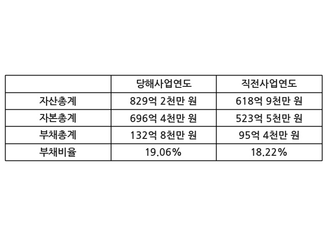 또한, 이번사업연도의 자산총계는 829억 2천만 원으로 직전사업연도 대비 33.99% 증가한 한편, 부채총계는 132억 8천만 원으로 39.21% 증가, 자본총계는 696억 4천만 원으로 33.03% 증가했다.