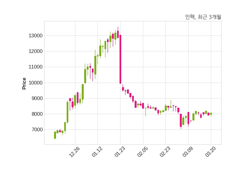 한편, 인팩은 장 마감 이후 해당 기업공시를 발표했으며 오늘 종가가 8,060원, 거래량은 24,498주로, 직전 거래일 대비 140원(+1.77%) 상승했다.