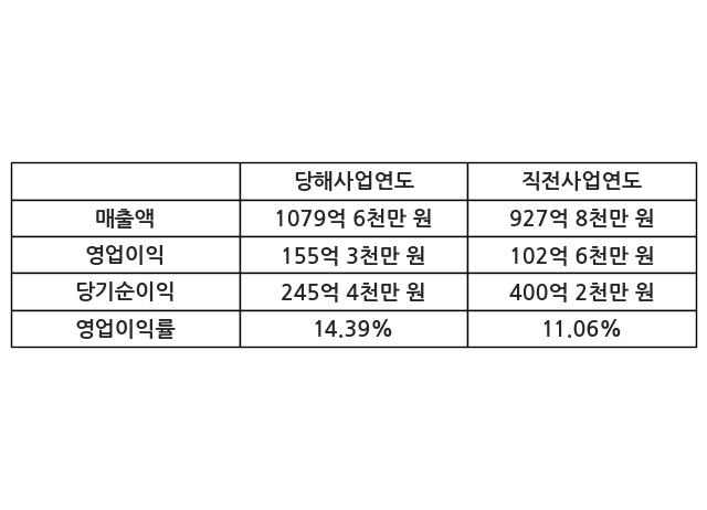 이번사업연도의 매출액은 직전사업연도 대비 16.35% 증가한 1079억 6천만 원, 영업이익은 155억 3천만 원, 당기순이익은 245억 4천만 원이라고 공시했다.