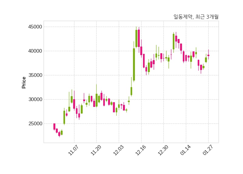 한편, 일동제약은 장 마감 이후 해당 기업공시를 발표했으며 오늘 종가가 39,000원, 거래량은 601,718주로, 직전 거래일 대비 350원(+0.91%) 상승했다.