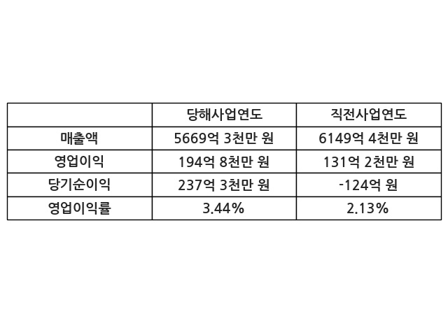 이번사업연도의 매출액은 직전사업연도 대비 -7.81% 감소한 5669억 3천만 원, 영업이익은 194억 8천만 원, 당기순이익은 237억 3천만 원이라고 공시했다.