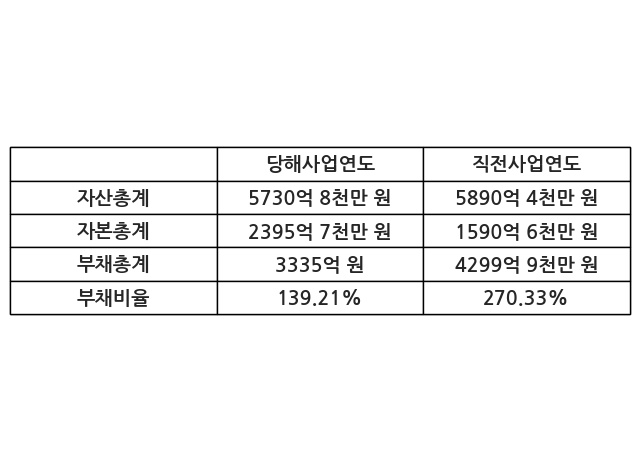 또한, 이번사업연도의 자산총계는 5730억 8천만 원으로 직전사업연도 대비 -2.71% 감소한 한편, 부채총계는 3335억 원으로 -22.44% 감소, 자본총계는 2395억 7천만 원으로 50.62% 증가했다.