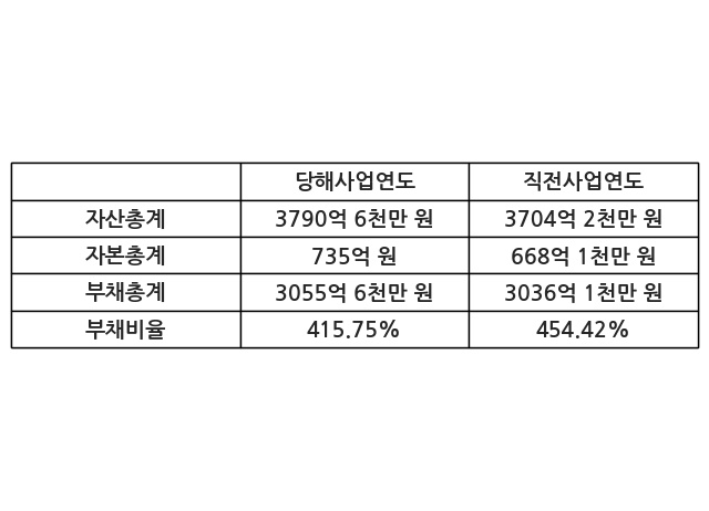 또한, 이번사업연도의 자산총계는 3790억 6천만 원으로 직전사업연도 대비 2.33% 증가한 한편, 부채총계는 3055억 6천만 원으로 0.64% 증가, 자본총계는 735억 원으로 10.01% 증가했다.