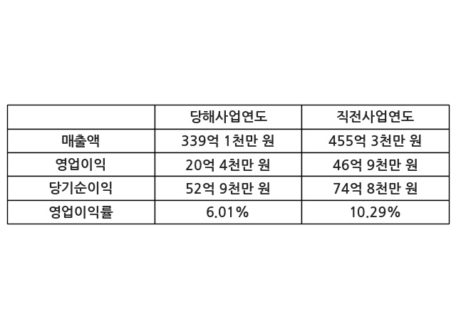 이번사업연도의 매출액은 직전사업연도 대비 -25.53% 감소한 339억 1천만 원, 영업이익은 20억 4천만 원, 당기순이익은 52억 9천만 원이라고 공시했다.