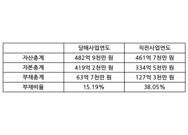 또한, 이번사업연도의 자산총계는 482억 9천만 원으로 직전사업연도 대비 4.58% 증가한 한편, 부채총계는 63억 7천만 원으로 -49.97% 감소, 자본총계는 419억 2천만 원으로 25.34% 증가했다.