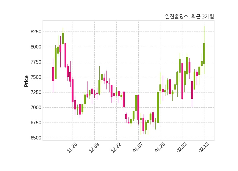 한편, 일진홀딩스의 11시 12분 현재주가는 8,060원으로 직전 거래일 대비 300원(+3.87%) 상승이며, 거래량은 186,635주이다.