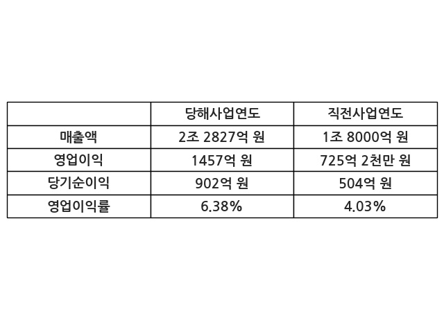 이번사업연도의 매출액은 직전사업연도 대비 26.82% 증가한 2조 2827억 원, 영업이익은 1457억 원, 당기순이익은 902억 원이라고 공시했다.