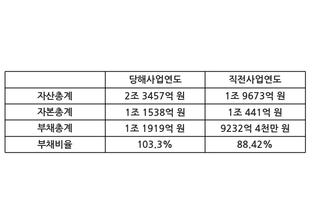 또한, 이번사업연도의 자산총계는 2조 3457억 원으로 직전사업연도 대비 19.23% 증가한 한편, 부채총계는 1조 1919억 원으로 29.1% 증가, 자본총계는 1조 1538억 원으로 10.51% 증가했다.
