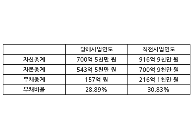또한, 이번사업연도의 자산총계는 700억 5천만 원으로 직전사업연도 대비 -23.61% 감소한 한편, 부채총계는 157억 원으로 -27.33% 감소, 자본총계는 543억 5천만 원으로 -22.46% 감소했다.