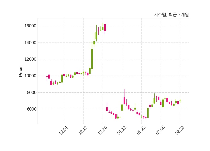 한편, 저스템의 13시 22분 현재주가는 7,020원으로 직전 거래일 대비 420원(+6.36%) 상승이며, 거래량은 1,048,609주이다.