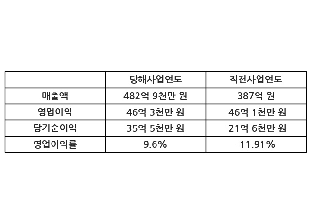 이번사업연도의 매출액은 직전사업연도 대비 24.78% 증가한 482억 9천만 원, 영업이익은 46억 3천만 원, 당기순이익은 35억 5천만 원이라고 공시했다.