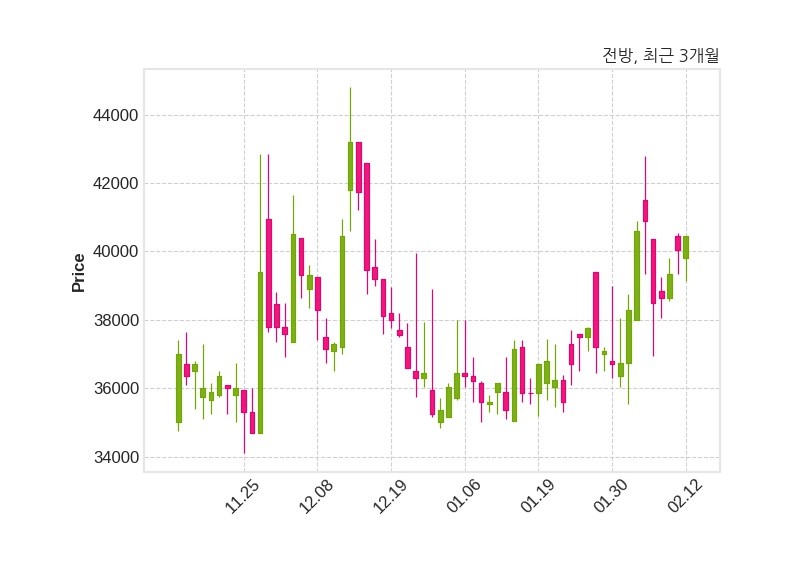 한편, 전방은 장 마감 이후 해당 기업공시를 발표했으며 오늘 종가가 40,450원, 거래량은 3,826주로, 직전 거래일 대비 400원(+1.0%) 상승했다.
