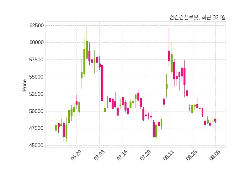 한편, 전진건설로봇은 장 마감 이후 해당 기업공시를 발표했으며 오늘 종가가 48,500원, 거래량은 17,722주로, 직전 거래일 대비 50원(-0.1%) 하락했다.
