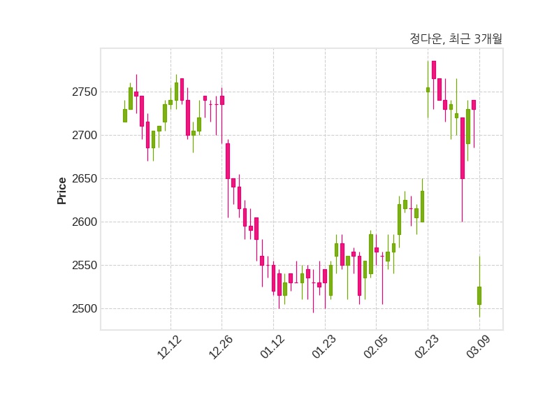 한편, 정다운은 장 마감 이후 해당 기업공시를 발표했으며 오늘 종가가 2,525원, 거래량은 367,265주로, 직전 거래일 대비 205원(-7.51%) 하락했다.