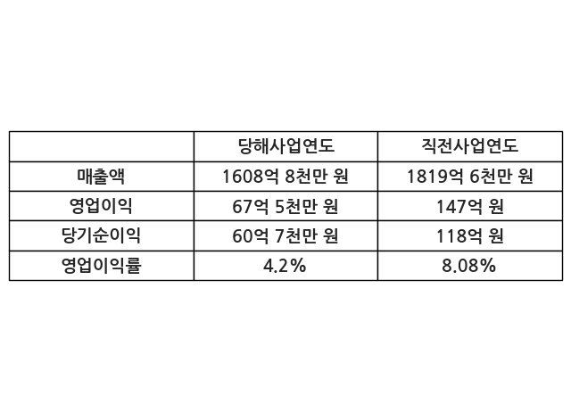 이번사업연도의 매출액은 직전사업연도 대비 -11.59% 감소한 1608억 8천만 원, 영업이익은 67억 5천만 원, 당기순이익은 60억 7천만 원이라고 공시했다.