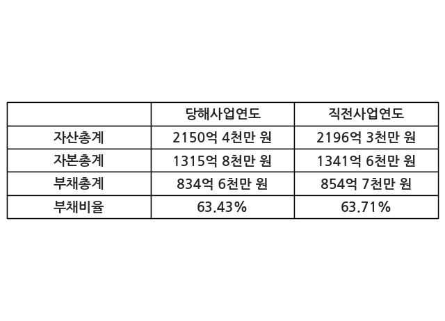 또한, 이번사업연도의 자산총계는 2150억 4천만 원으로 직전사업연도 대비 -2.09% 감소한 한편, 부채총계는 834억 6천만 원으로 -2.35% 감소, 자본총계는 1315억 8천만 원으로 -1.92% 감소했다.