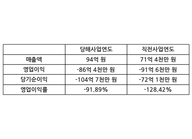 이번사업연도의 매출액은 직전사업연도 대비 31.79% 증가한 94억 원, 영업이익은 -86억 4천만 원, 당기순이익은 -104억 7천만 원이라고 공시했다.